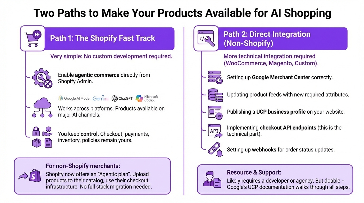 If you’re not on Shopify but want this fast track, Shopify now offers an “Agentic plan” specifically for this. You upload your products to their catalog and use their checkout infrastructure to sell through AI channels. You don’t need to migrate your entire ecommerce stack.