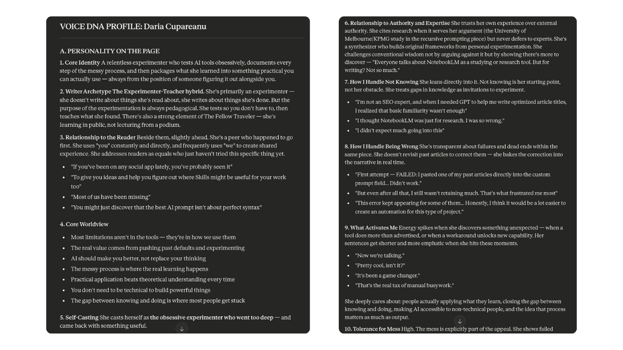 To give you a sense of what this produces, I ran the prompt on my most popular articles, and the result was a 4,500-word voice analysis. Clear, thorough, and specific enough that when Claude uses it, the difference is immediate. Here’s a snippet: