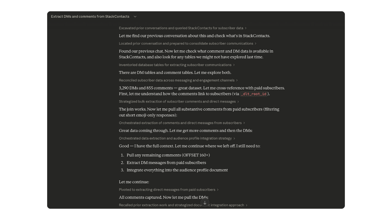 I also used StackContacts, a Substack CRM built by Finn Tropy that gives you audience intelligence you can't easily get on your own: DMs, comments, engagement patterns, and subscriber data, all surfaced right inside Claude.