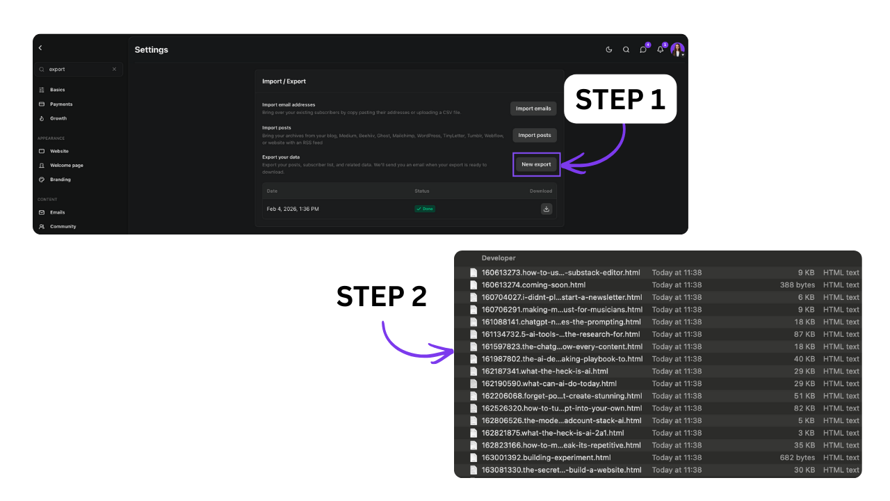 Option 3: If you don’t have them stored anywhere, go to Settings → Export all your data. Among the export you’ll find your articles (even drafts) as HTML files, which any LLM can read perfectly.