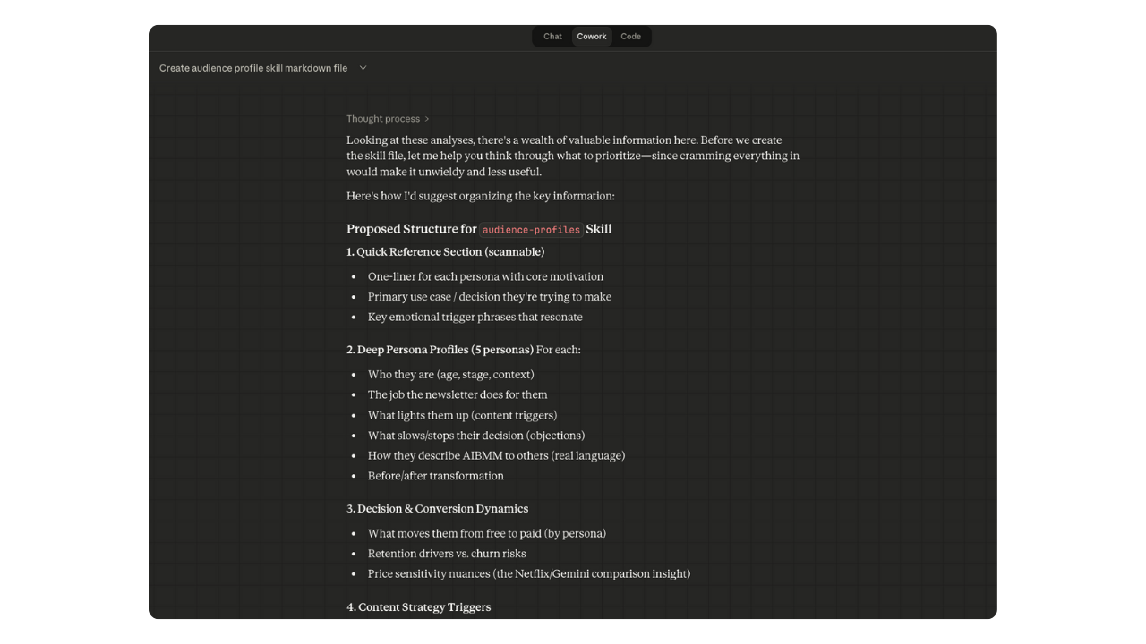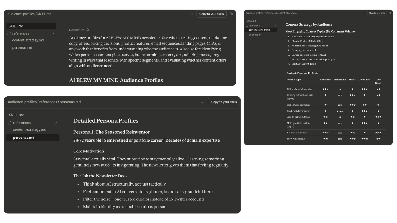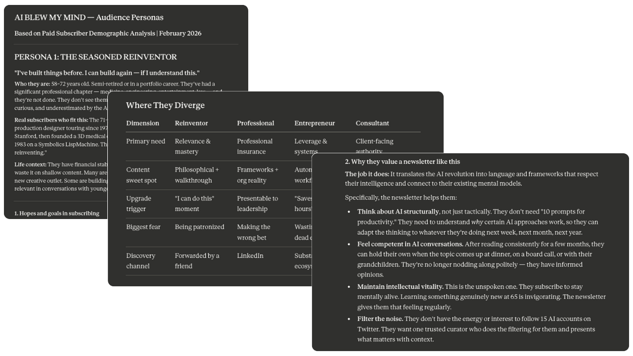 What this skill does: It tells AI exactly who you're writing for. Their role, their daily frustrations, what moves them from free to paid, how they talk about their own problems, even what makes them unsubscribe. (Mine has five distinct personas, each with their own conversion triggers, content preferences, and the exact words they use to describe why they read.)