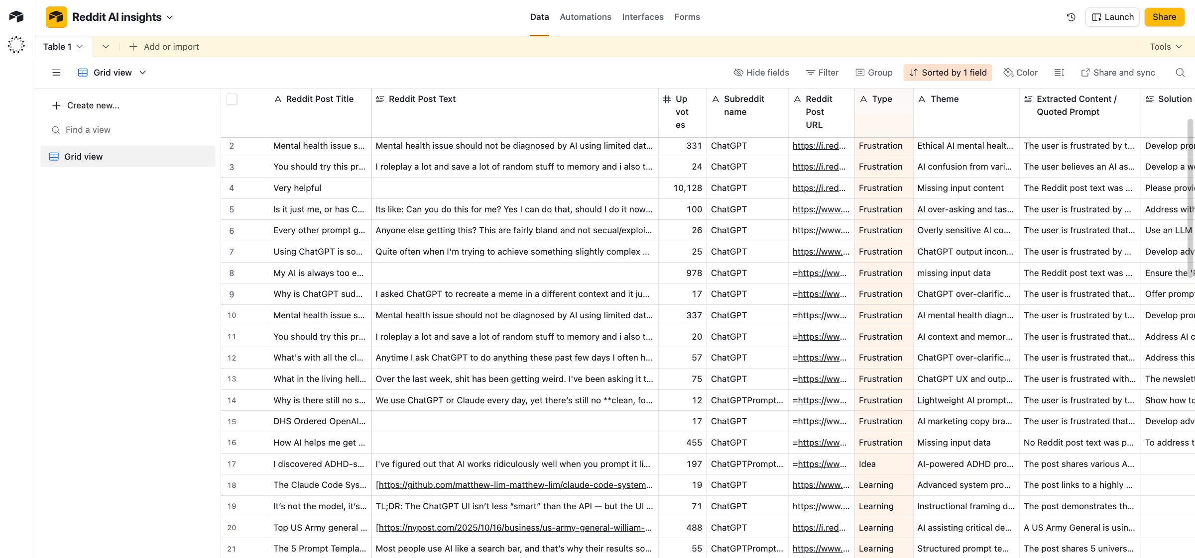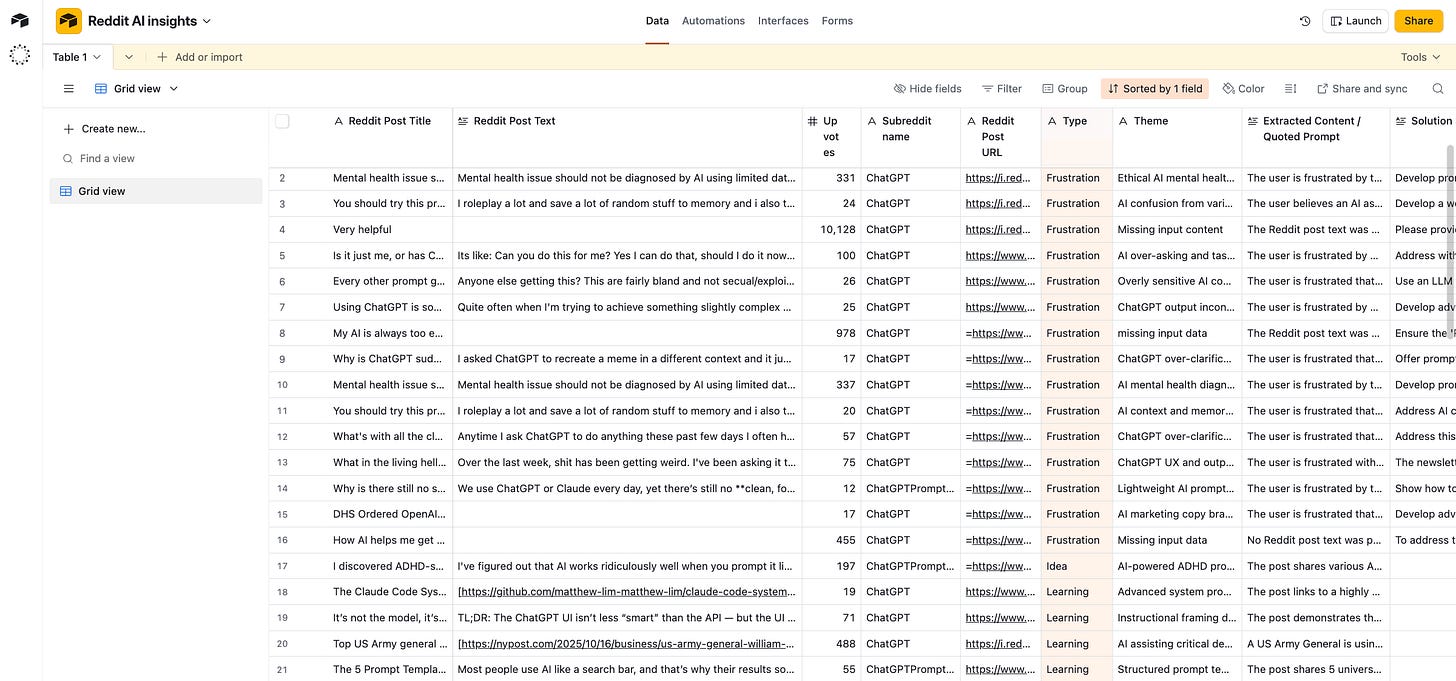 It saves everything in one place. All the data goes into Airtable (but you can change to Sheets): post titles, summaries, links, upvotes, categories, themes, and suggestions.