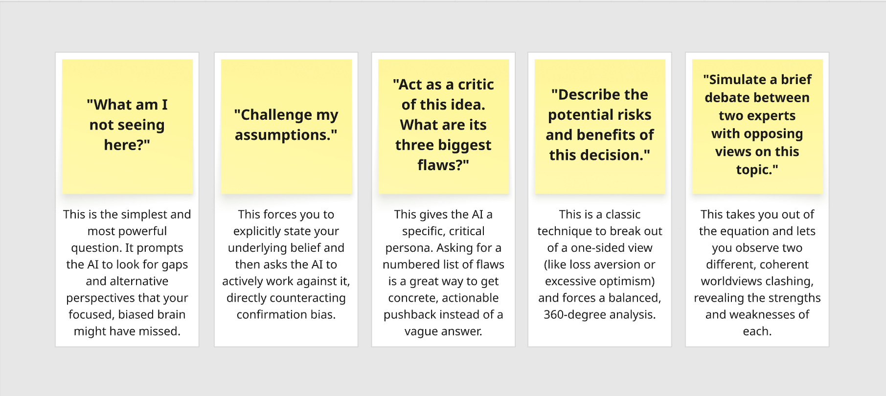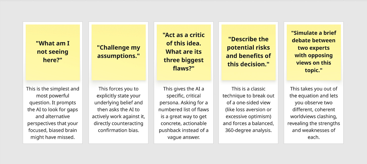 The good news is that simply building a habit of doubting our own thinking, and remembering to add these questions in every conversation with AI, will help us instantly engage our ‘Pilot’ (System 2) and get a more objective view.