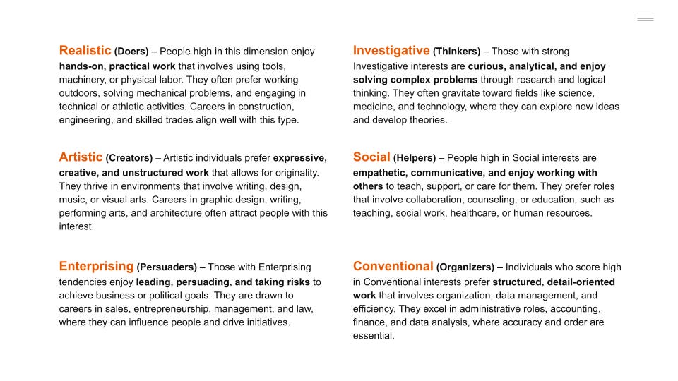 and I were building a career manager that used personality testing (based on the Holland RIASEC model) combined with AI storytelling to help people understand career compatibility.We licensed a comprehensive personality test, integrated a database of over 1000 occupations to gather extensive insights into each profession, and applied an algorithm that matched personality traits with career requirements.
