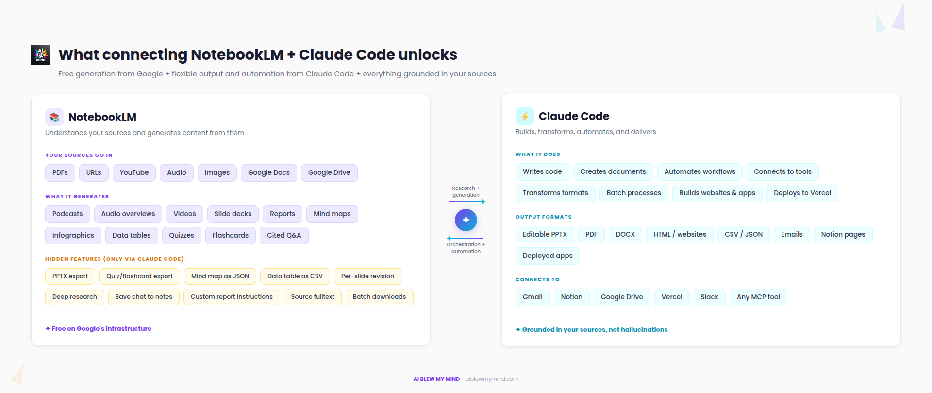 When you connect them, you get the best of both: free generation from Google’s infrastructure, flexible output and automation from Claude Code, and everything grounded in your sources.