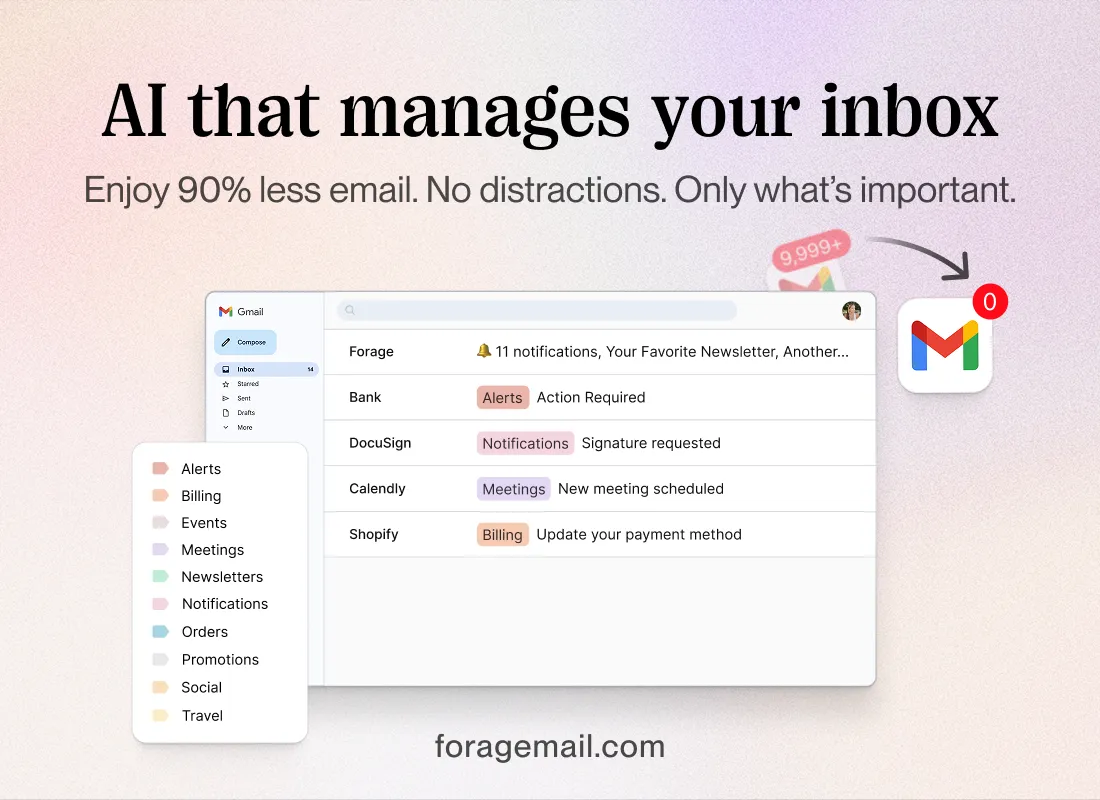 After years of my manual methods completely failing—from trying to tackle the clutter head-on, to creating filter systems, to just anxiously scanning my inbox for emergencies—I got over my fear of losing control over my inbox and gave Forage Mail a shot.