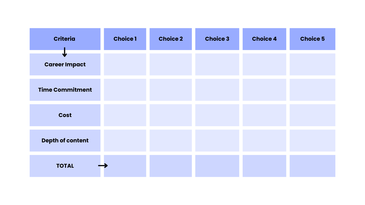 Right now, I’m choosing between <<<three online learning programs>>>. I already know what matters to me, I just need help laying it all out in a clear, weighted decision matrix.