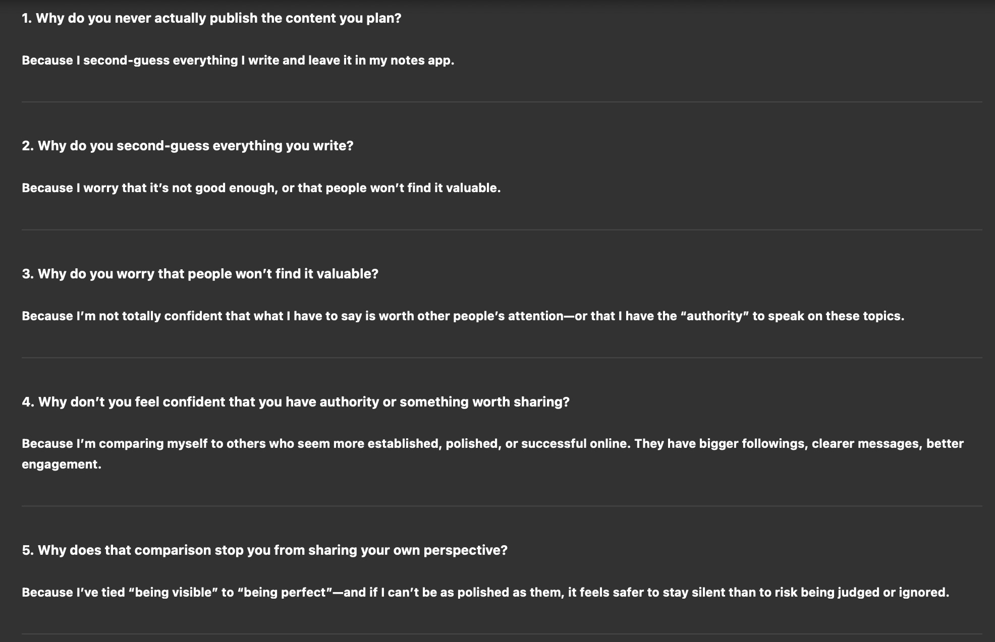 Once you’ve reached the fifth why, give me a short reflection on what you think the real blocker might be, and then suggest one practical action I could take this week to work around it.And here’s what it came back with when I tested the exact prompt: