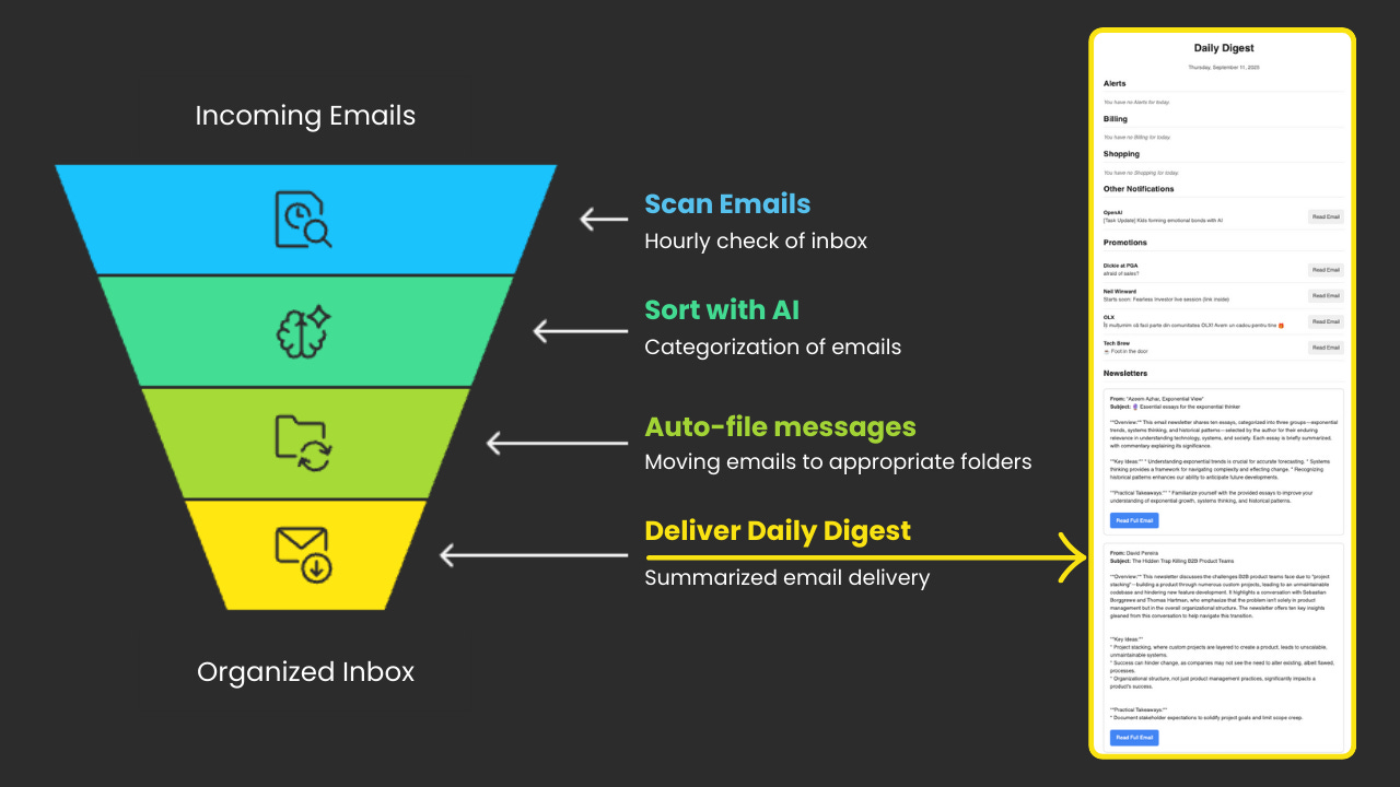 Overwhelmed by your Gmail inbox? This 15-minute automation sorts your emails, clears the clutter, and delivers one daily digest with all messages organized and newsletters condensed into summaries.
