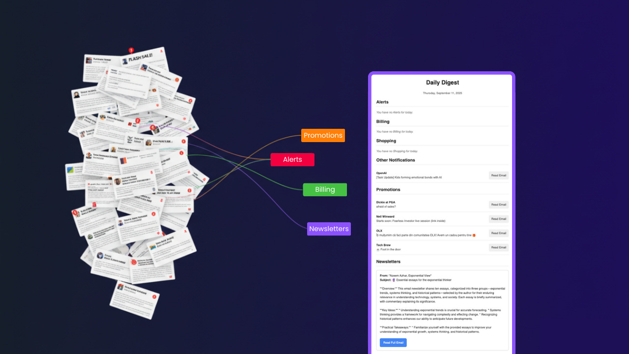 Delivers a daily digest → one clean email per day with everything organized by category. Newsletters come as short summaries with links back to the originals, so you can decide what you want to deep dive and read in full.